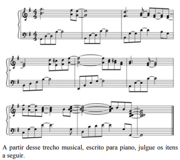 3) CEBRASPE | SEE PE 2023 | PROFESSOR DE MÚSICA | No sétimo compasso, a melodia escrita na clave de fá contém o arpejo do acorde que corresponde ao quarto grau da tonalidade do referido trecho.
