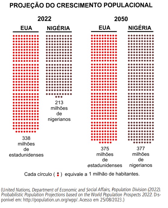 1) COMVEST | UNICAMP 2024 | | QUESTÃO 50 As projeções de população são importantes para o cálculo dos indicadores sociodemográficos que fornecem subsídios para a formulação de políticas públicas. Segundo as Nações Unidas, o mundo atingiu a cifra de 8 bilhões de habitantes em 2022, devendo atingir 9,7 bilhões em 2050. Ainda que a população mundial continue a aumentar, a dinâmica demográfica varia entre as regiões do mundo. Nesse contexto, Estados Unidos da América (EUA) e Nigéria passam por mudanças demográficas com reflexos socioeconômicos significativo